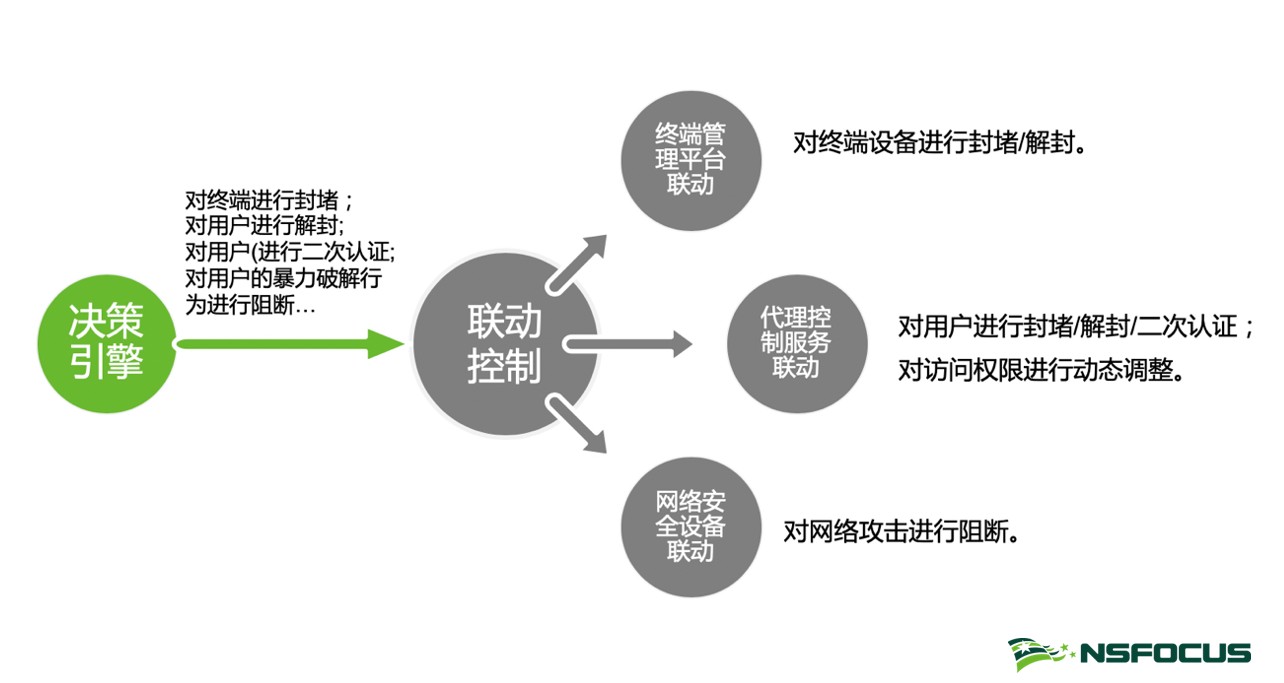 动态决策,基于用户、设备和访问行为的风险情况,动态执行响应的防御动作。信任评估引擎完成对用户、设备,以及访问行为的可信评估,再由策略控制引擎完成自动化的访问控制动作。