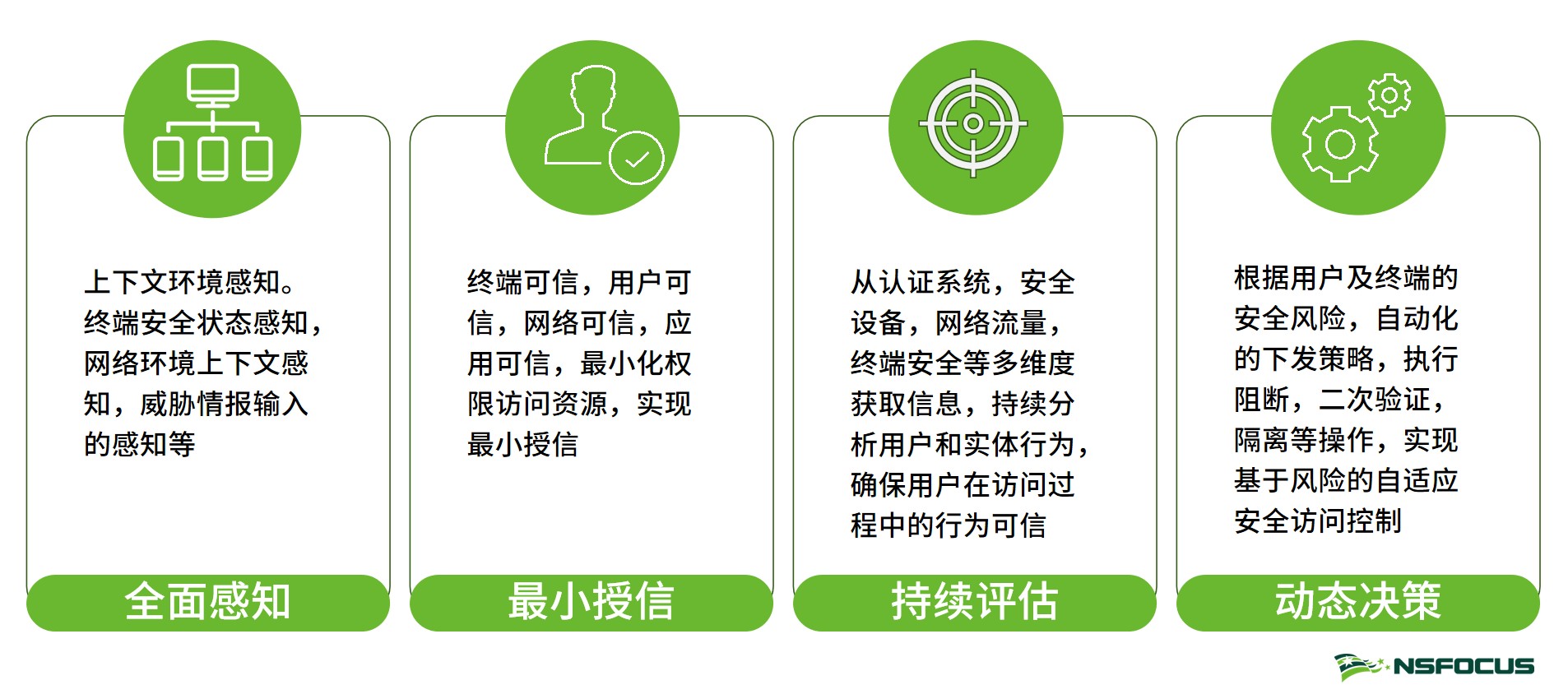 零信任的核心理念是:除非得到验证,否则不信任。对于无边界的网络访问而言,后台的应用和资源,需要验证来访的人和设备。这是零信任的基础,即用户可信,设备可信。初次访问,只需要验证二者即可,建立访问会话之后,还需要持续评估访问行为的可信,确认来访问的用户和设备始终保持在安全状态,没有任何异常行为,一旦出现了异常,能够及时的自动化的处理,比如信任等级降低,重新认证,或者直接切断访问会话。零信任安全的支柱,包含以下四个要素:全面感知、最小授信、持续评估、动态决策。