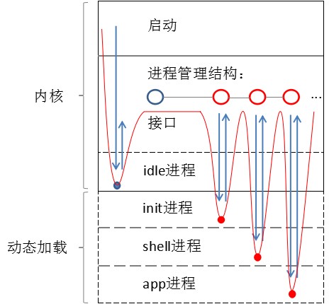 ① 内核代码,一部分在刚开机时执行,没有进程上下文,一部分在创建进程后,被进程"调用"执行,有进程上下文;