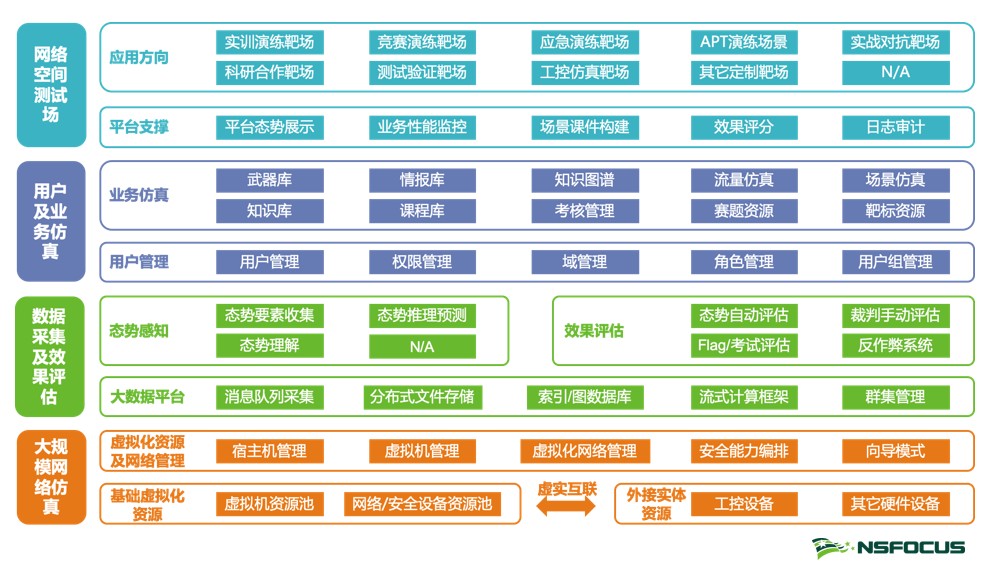 结合以上两种说法以及绿盟科技的实践,我们认为,网络靶场是通过虚拟化,虚实结合,安全编排,行为及流量仿真,效果评估等技术综合构建而成的一个真实“冗余环境”。类似于我们印象中的“训练基地”。这个环境可以用于完成人才培养、竞赛演练、应急演练、实战演练、设备测试、技术研究和效能评估等任务,响应国家网络强国战略,批量培养网络安全人才队伍,同时加快网络安全基础建设,提高现有网络环境的稳定性、安全性和性能。