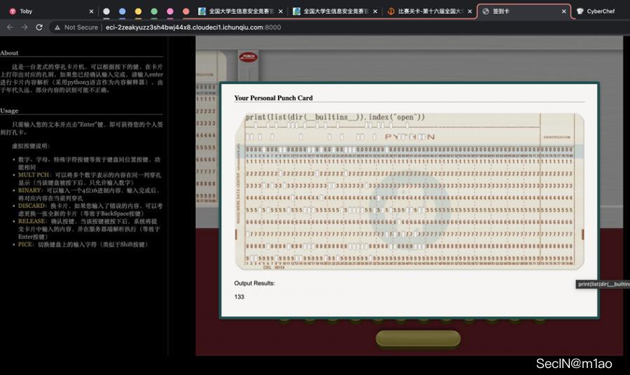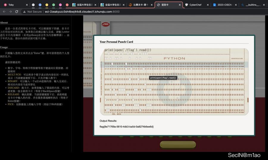 确实可以用,接下来猜测 flag 的位置,通常在 /flag,直接构造print(open('/flag').read()),输入打孔卡片得到结果: