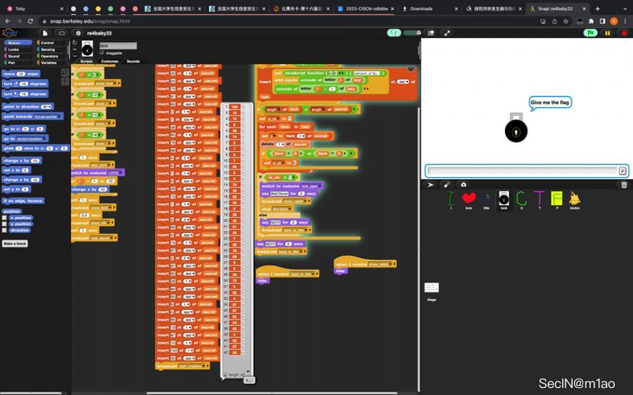 a.interactive()查看 xml 文件,发现是 Berkeley Snap,拖入 Snap 中尝试运行。双击动画播放后的锁图标,可以看到对应的代码块: