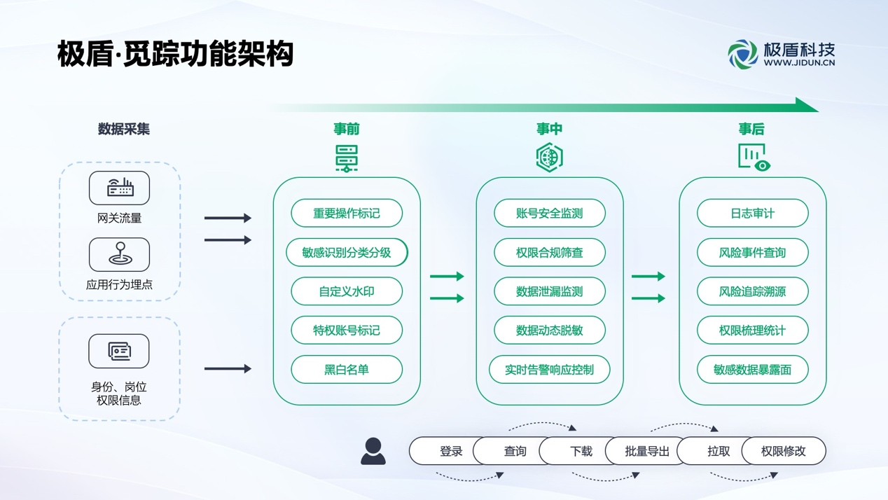 极盾科技自研的“业务领域数据安全管控平台—极盾·觅踪”,通过用户实体行为分析(UEBA)、敏感数据识别、风险识别与告警、 动态数据脱敏、访问控制、水印保护等核心技术,为企业提供针对业务系统“数据流通使用”场景,进行免改造应用的细粒度安全管控服务。