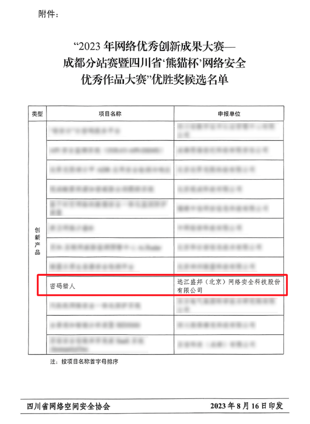“2023年网络安全优秀创新成果大赛—成都分站赛暨四川省‘熊猫杯’网络安全优秀作品大赛”成功举办。本次比赛由四川省委网信办指导,中国网络安全产业联盟(CCIA)主办,成都信息工程大学、四川省网络空间安全协会承办。本次比赛评审专家组由来自四川省相关行业部门、高校、CCIA专家委以及网络安全投资机构的资深专家组成,评审专家组对来自全国近50余家网络安全企业的60余项解决方案和创新产品进行了严格的评选。盛邦安全创新产品——“密码猎人”RayHunter在众多参赛作品中脱颖而出,荣获大赛优胜奖。