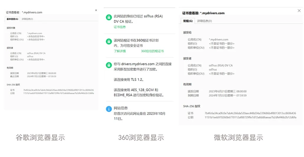 按照上述操作,我们可以查看drivers.mydrivers.com这个网站部署的SSL证书类型,可以看到此网站颁发者-公用名(CN)处显示sslTrus (RSA) DV CA,这就表示这是由sslTrus签发给*.mydrivers.com的DV SSL证书。