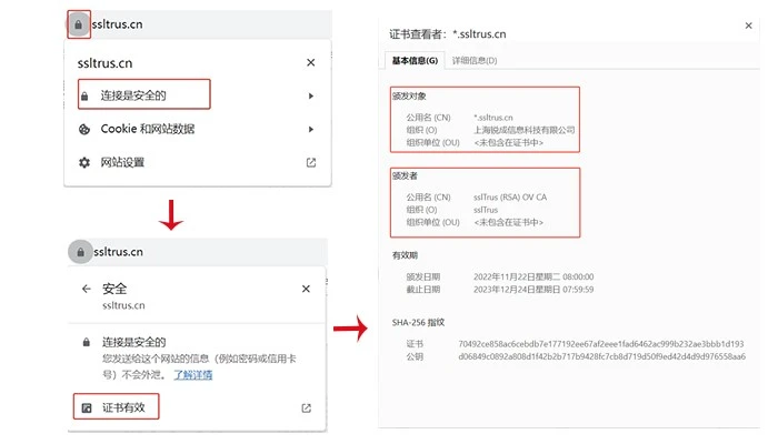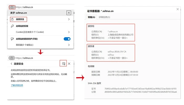 点击安全锁后,会出现选项详情框,依次点击“连接是安全的”-“证书有效”就可以看到证书详情框,在颁发者-公用名(CN)处,就可以看到SSL证书类型,此处显示“sslTrus (RSA) OV CA”,表示由sslTrus签发给上海锐成信息科技有限公司所属域名*.ssltrus.cn的OV SSL证书。