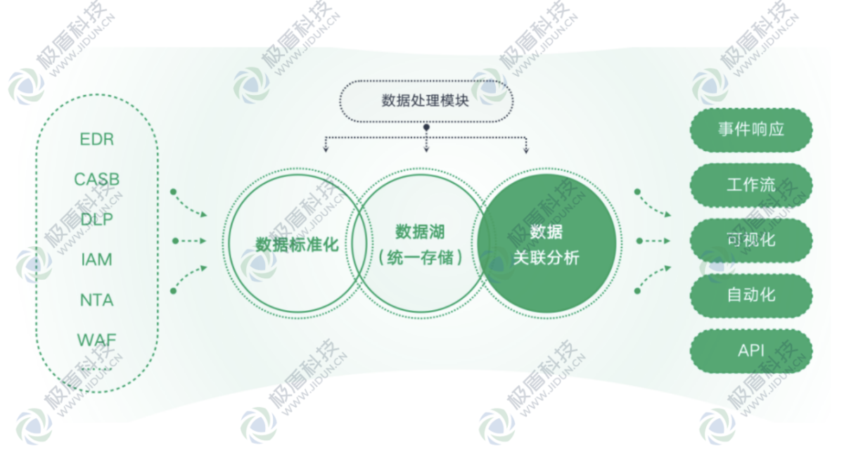 2、结合安全信息和事件管理(SIEM)、安全编排自动化和响应(SOAR)、端点检测与响应(EDR)以及网络流量分析(NTA)等现有能力,集中安全数据和事件响应,进行统一管理、统一分析,大大提升内部网络安全运营效率。