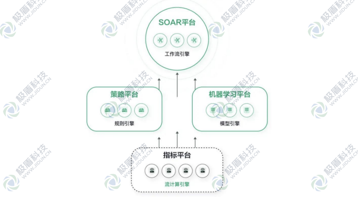 智能决策系统上层:以工作流引擎为核心构建的SOAR平台,可以按照策略和模型的检测结果采取不同的响应措施,响应组件支持包括接口、脚本、邮件、常见安全设备等多种类型。