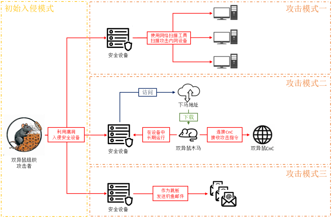 已确认的双异鼠组织行动中,调查人员发现攻击者的主要攻击模式大致可分为三类,而每类攻击模式根据不同的设备有细节上的调整,如下图所示。