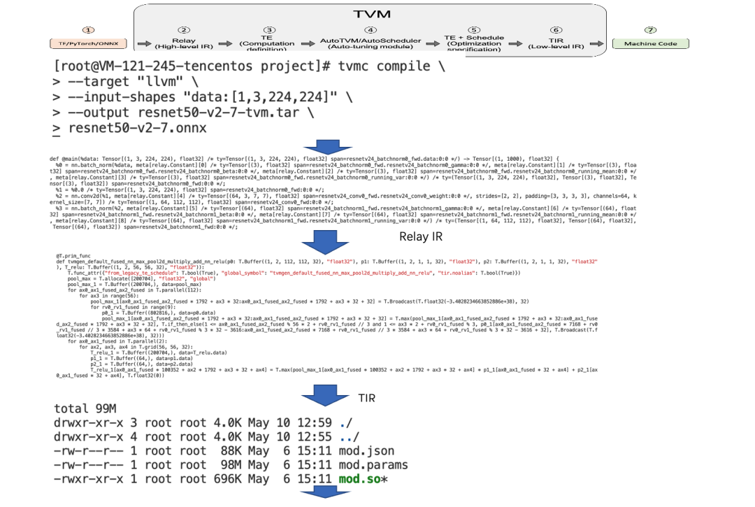多层IR转换以后,最后生成指定的后端文件,如上图所示TVM编译会生成三个文件:mod.json是模型的计算图描述文件,mod.so是经过优化生成的算子,mod.param是存储的模型参数文件,其文件格式如下: