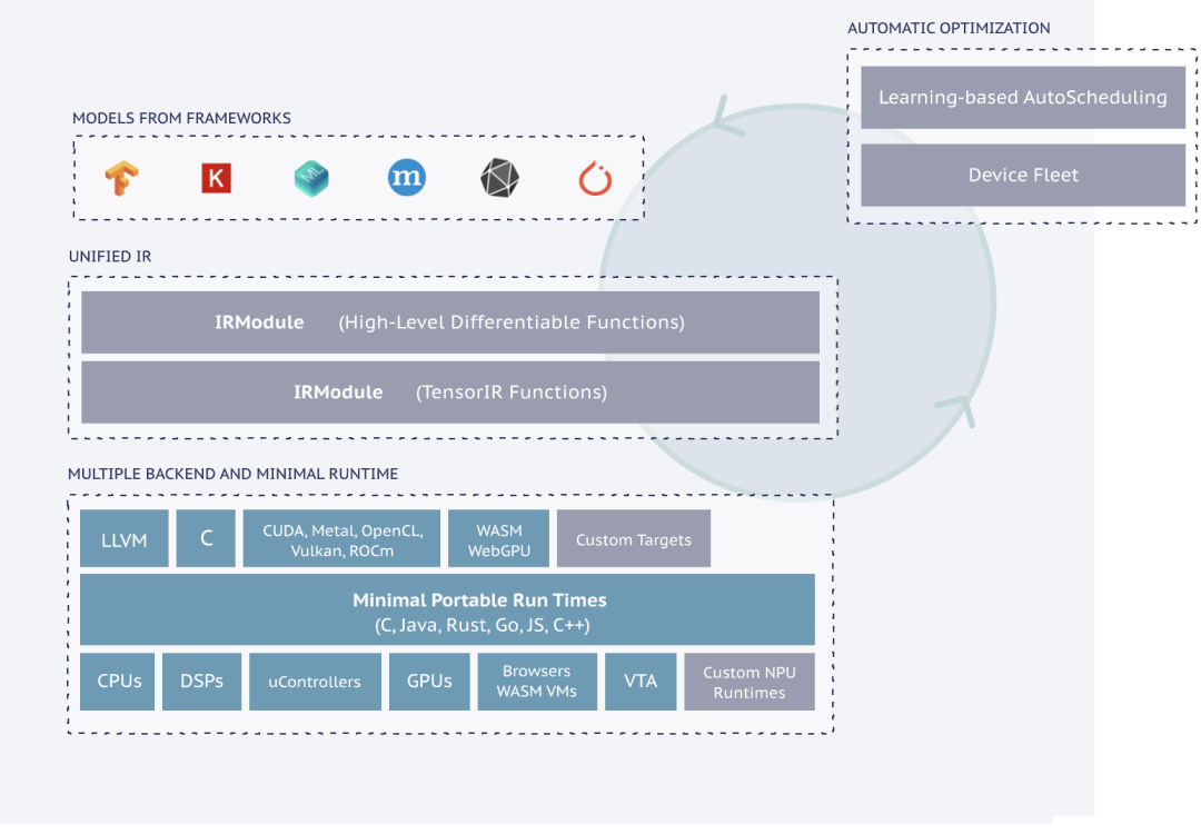 丰富的后端:可以在CPU、GPU、浏览器、微控制器、FPGA等硬件上运行,同时可自动在多种后端生成和优化张量算子。