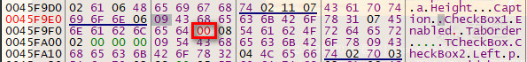 方法一: Delphi 的控件放在 RC Data 中,主要属性都可以看到 ASCII 的属性名称,比如你要改一个 CheckBox,在16进制数据中找到这个控件,看它后面的属性,找到 "Enabled",将后面一个字节改为"0"即可(找不到地方的话,可以用 Resource Tuner 查找资源定位)