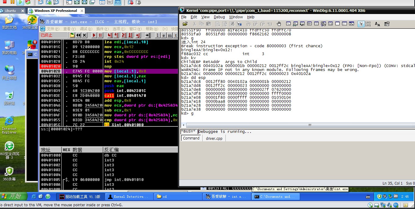 __asm nop //od和windbg配合的时候从内核返回到用户空间,od显示的是int 0x24往后推两个字符,并且od标明程序的状态是已结束。。