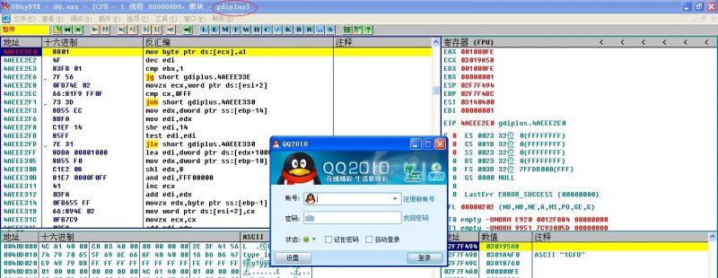 用OD加载QQ.exe 然后运行会中断在这个位置,如图: