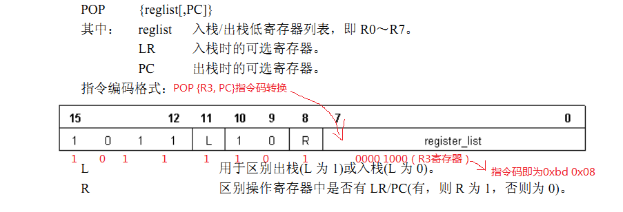 POP指令编码格式中的register_list八位,每一位表示一个寄存器,例如有R3寄存器时,第三位则为1。