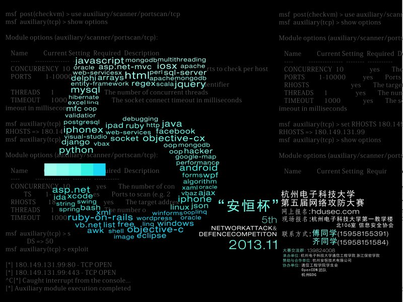杭州电子科技大学信息安全协会(简称安协)承办的网络攻防大赛是一项公益性大学生科技活动,该项比赛是在当今社会计算机网络安全越来越重要的背景下应运而生的,目的在于宣传信息安全知识,培养创新精神,提升团队合作意识,扩大大学生的科学视野。今年我们携手杭州安恒信息技术有限公司举办“安恒杯”杭州电子科技大学第五届网络攻防大赛暨CTF网络攻防邀请赛。