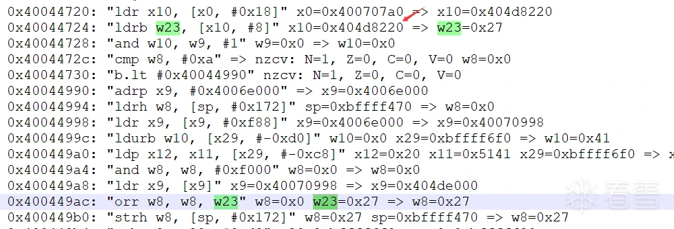 就一个简单算法,求和,取反,异或对照着直接译出来即可。算法输入参数就是v374,结合trace文件,我们可以打印下v374的0至23位,并找到对应的赋值点并编上号便于后面进行分析