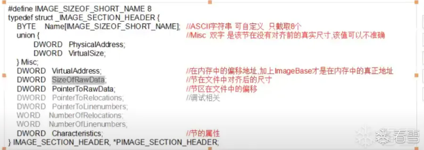 1 2 3 4 5 6 7 8 9 10 11 12 13 14 15 | typedef struct _IMAGE_SECTION_HEADER {