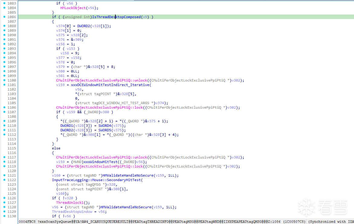 根据查阅以往Win泄露源码得知消息事件底层是通过xxxScanSysQueue处理的,但win32k改动过大且大部分都未公开无符号信息,因此只能作为参考
