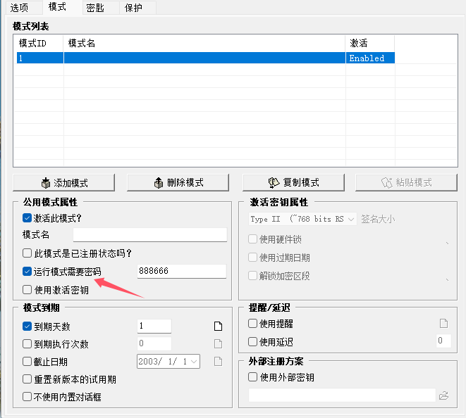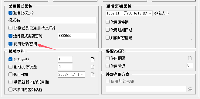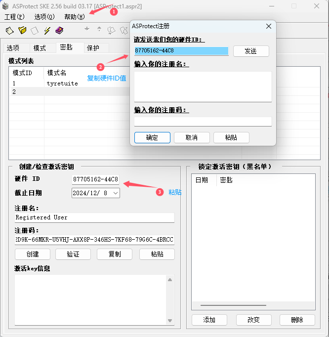 要启用激活密钥属性,必须选中“使用激活密钥”选项。此外,通过“帮助 -> 注册”可以获取密钥栏中的硬件ID。激活密钥属性是“使用激活密钥”保护策略的一部分,因此一旦绕过“使用激活密钥”选项,这个保护也将被绕过。