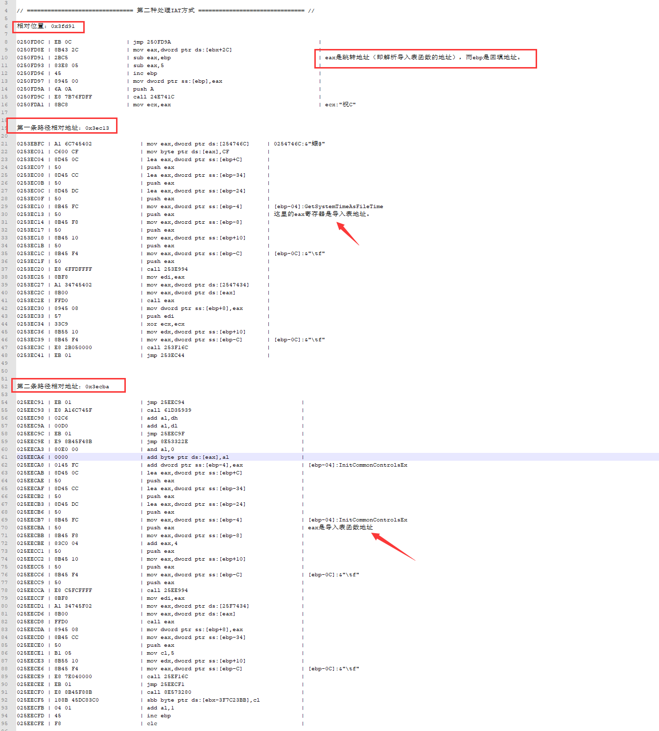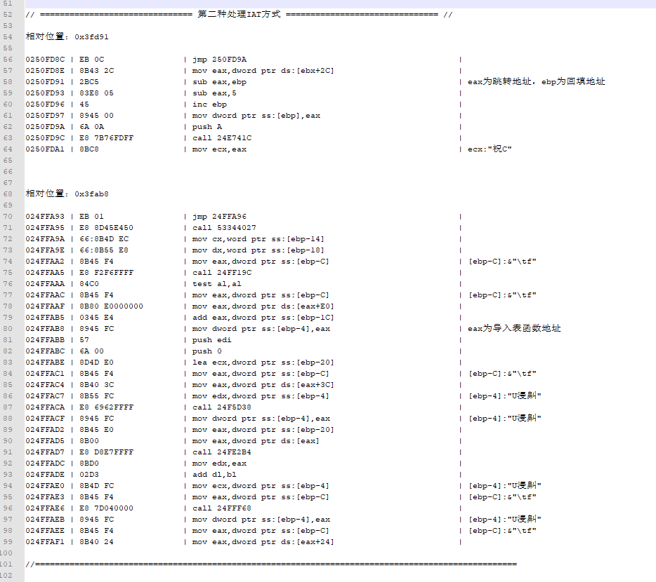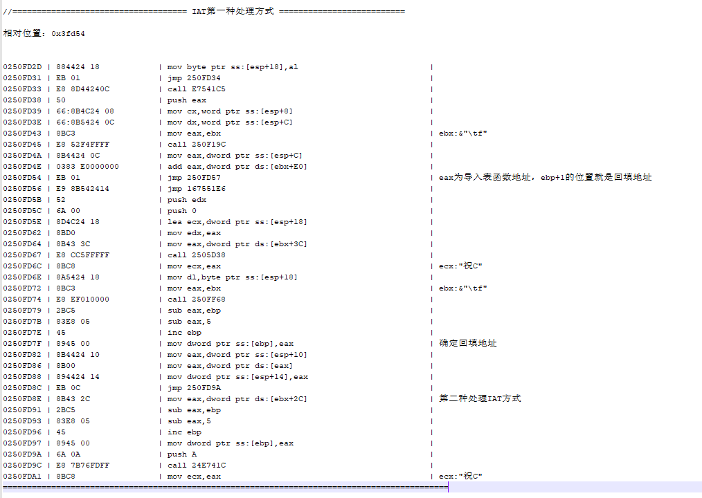 在断点触发的位置,向上追踪执行流程,即可定位IAT加密的实现代码。只要确定 IAT 表的三个关键要素(函数名称、函数地址以及回填地址),并在关键位置设置硬件执行断点,收集到与 IAT 表相关的必要信息后,便可完成对 IAT 表的修复。以下展示的是 IAT 表两种加密方式的关键位置代码。