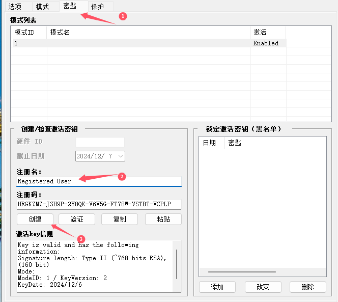 要使用此功能,请勾选“使用激活密钥”选项,然后在密钥栏中填写注册名,最后点击“创建”即可生成注册码。