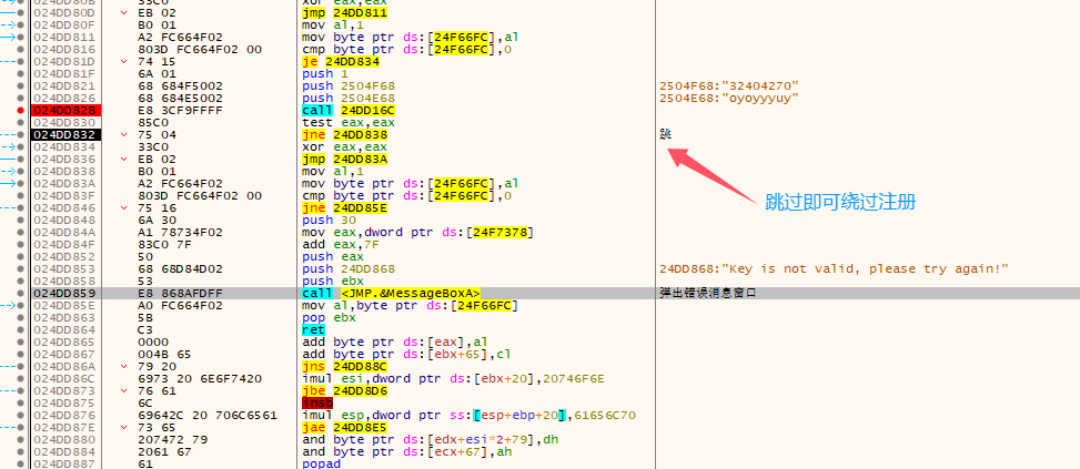 绕过这个注册窗口非常简单。只需在 MessageBoxA 函数处设置断点,然后回溯执行流程找到关键跳转并跳过它,即可成功绕过注册验证。