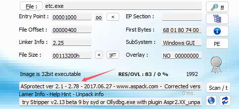 通过查壳工具检测发现,etc 程序受 ASProtect 2.x 版本的保护。