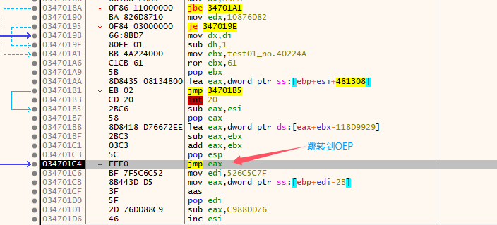 按 F9 继续运行。当进入地址 0x3470000 后,经过一系列解码操作,最终获取到真实 OEP 的确切地址。下方箭头所指的 jmp eax 指令即为跳转到真实 OEP 的指令。