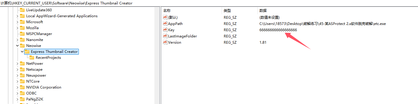 重启验证通常涉及到对注册表或 INI 文件的访问,可以通过设置相关的断点进行观察。通过调试分析可以发现,壳程序在解码过程中会访问注册表,其中 "Software\Neowise\Express Thumbnail Creator" 下保存了密钥和版本等信息,见下图: