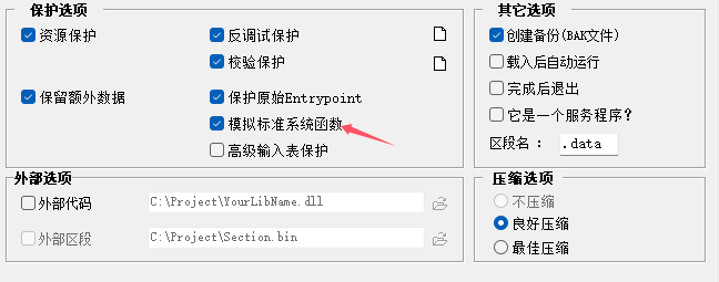模拟标准系统函数,不知是何意?分析勾选了此选项的被保护程序时,并未遇到显著的障碍。