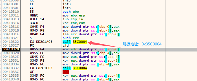要修复 IAT 表,首先需要找到加密的位置。在获取 OEP 入口后,定位到一个需要填写跳板地址的 call 指令(见下图),并设置硬件写入断点(注意要四字节对齐,否则断点会设置失败),然后重新开始调试。