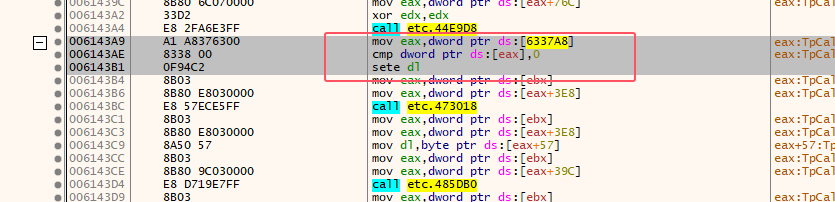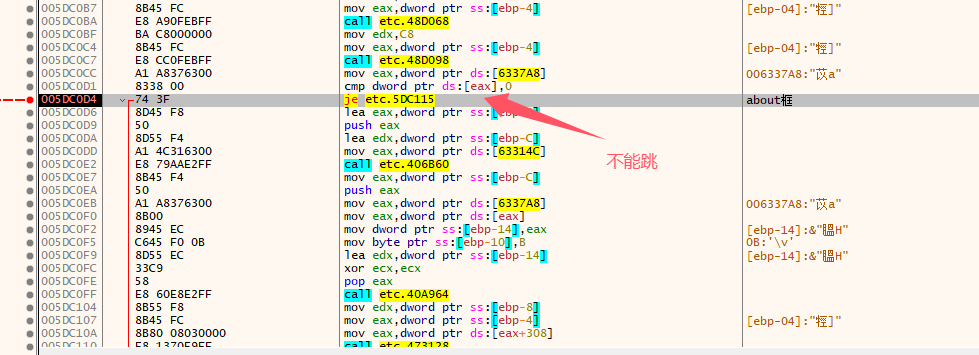 从上面的几行代码可以看出,eax 的值来源于地址 0x6337A8。因此,要去除 About 框中的试用版信息,0x6337A8 地址至关重要。可以尝试在该地址设置硬件访问断点。这样,当再次点击 About 窗口时,程序会在 0x5DC0D4 处中断。如果不进行跳转,程序将显示为注册版。