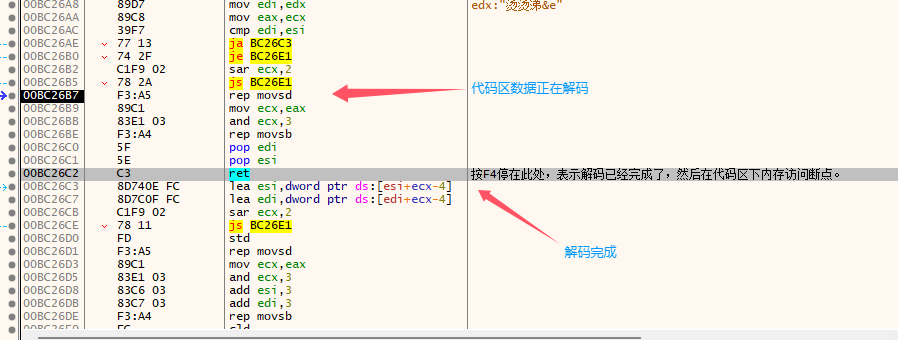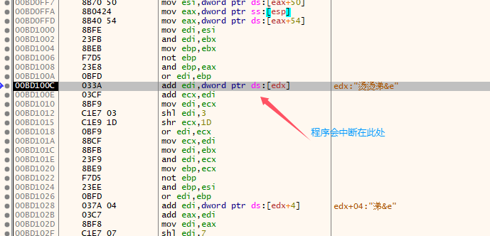 当程序运行到壳的入口时,在代码区的起始地址设置硬件写入断点。解码完成后,在代码区再次设置内存访问断点。