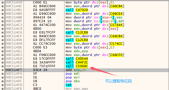 点击 0xC514F7 并按下 Enter 键进入汇编窗口(如下图)。其中 call 0xC5066C 是最终跳转到 OEP 的函数。因此,可以提取周围的特征码来定位到该位置。