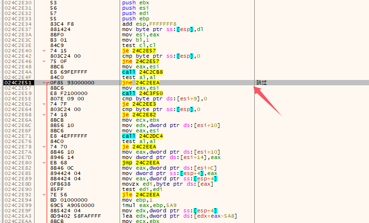 除此此外,还有另外两个位置需要改变跳转流程才能绕过此保护。可以通过单步调试来找到这两个关键位置。