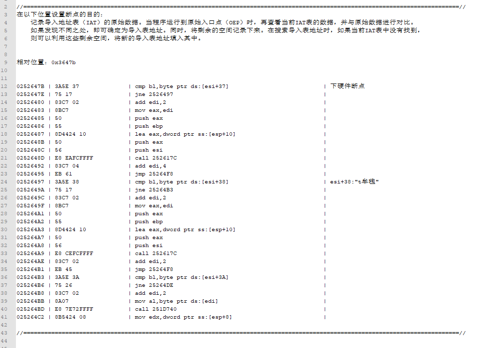 寻找初始化 IAT 表数据的具体方法:只需确定哪个 DLL 的导出表函数地址最先被填入 IAT 表中,然后在相应的 IAT 表地址处设置硬件写入断点。再次开始调试,当断点触发后,向上追踪执行流程,便可定位到初始化IAT表数据的实现代码(见下图)。