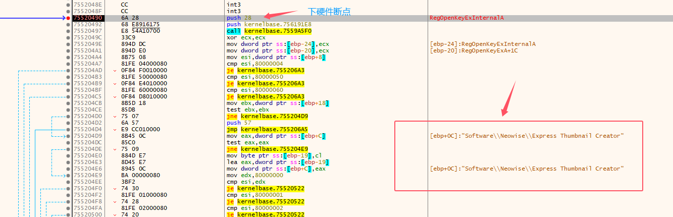 接下来,在 RegOpenKeyExInternalA处设置硬件断点,再继续运行程序。如果查询到的注册表项是 "Software\Neowise\Express Thumbnail Creator",则返回到用户区域。