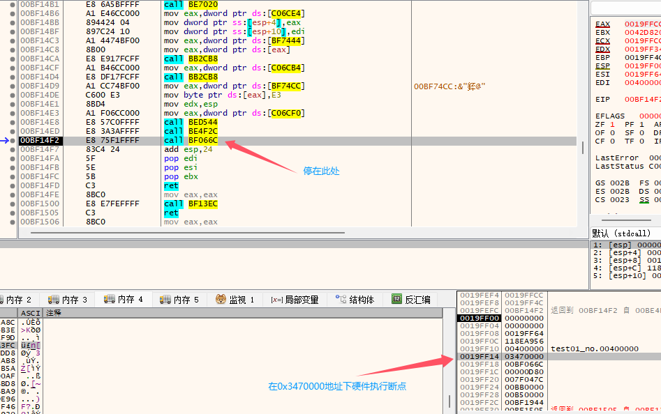 接着进行回溯。在回溯过程中,程序可能会跑飞直接运行,记录下来哪个函数跑飞的,然后再次调试并进入该函数。通过这种反复的过程,无需回溯太远,最终停在地址 0xBF14F2(如下图)。注意观察 esp+0x14 这个位置,在0x3470000地址下硬件执行断点。