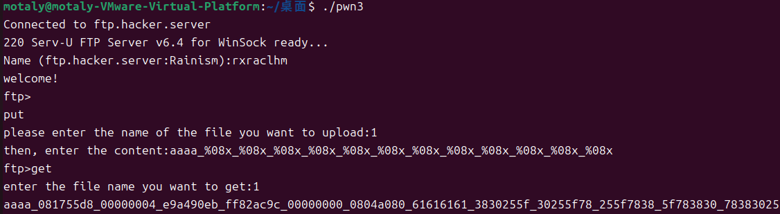 先是利用put输入文件名为/sh,内容为b'%8$s'+p32(got_addr)