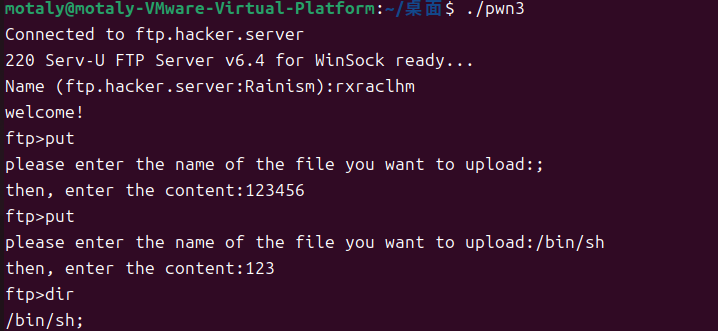 5.运用dir函数,因为函数会把文件名拼接,所以是"/bin/sh",而函数最后的返回puts函数已经是system函数,所以我们最后执行的是system("/bin/sh")