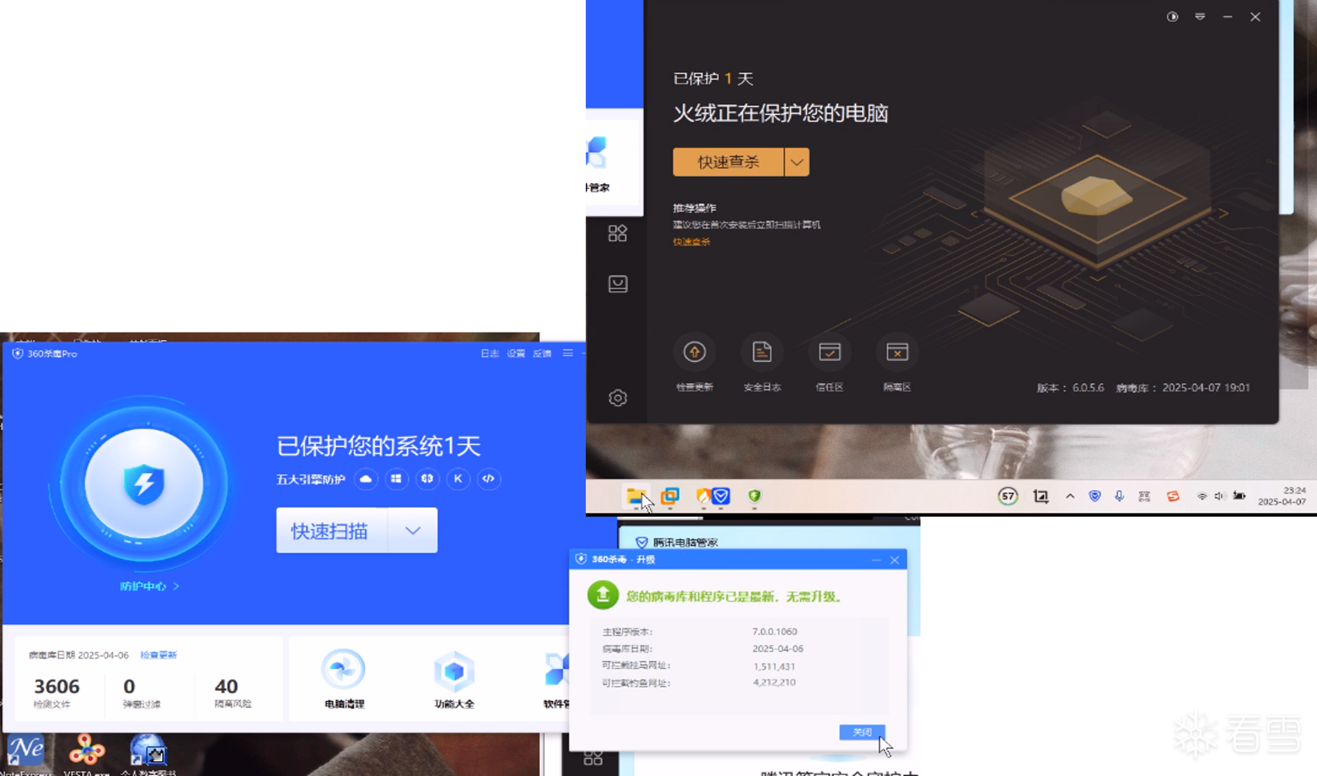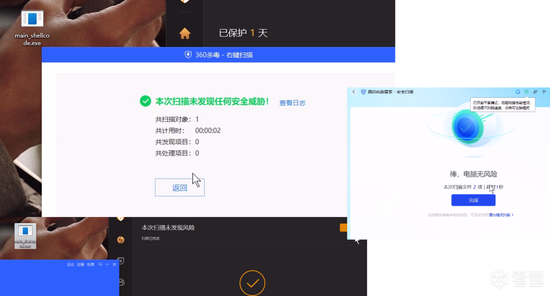 360 5个查杀引擎全部开启,火绒默认设置,腾讯管家默认配置