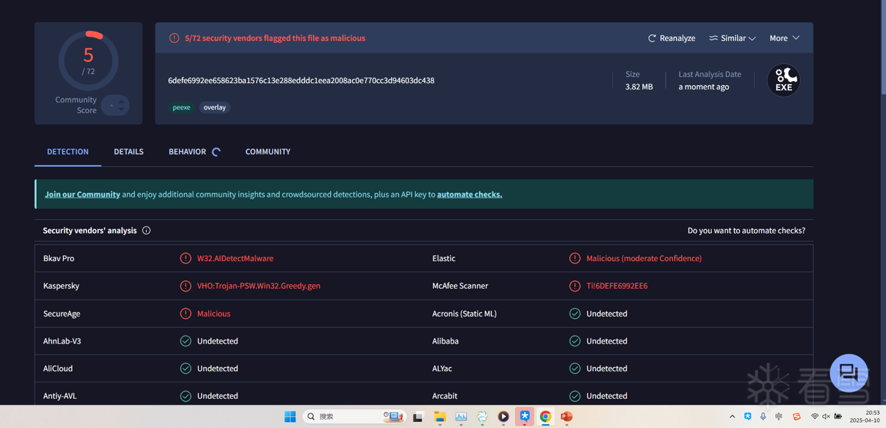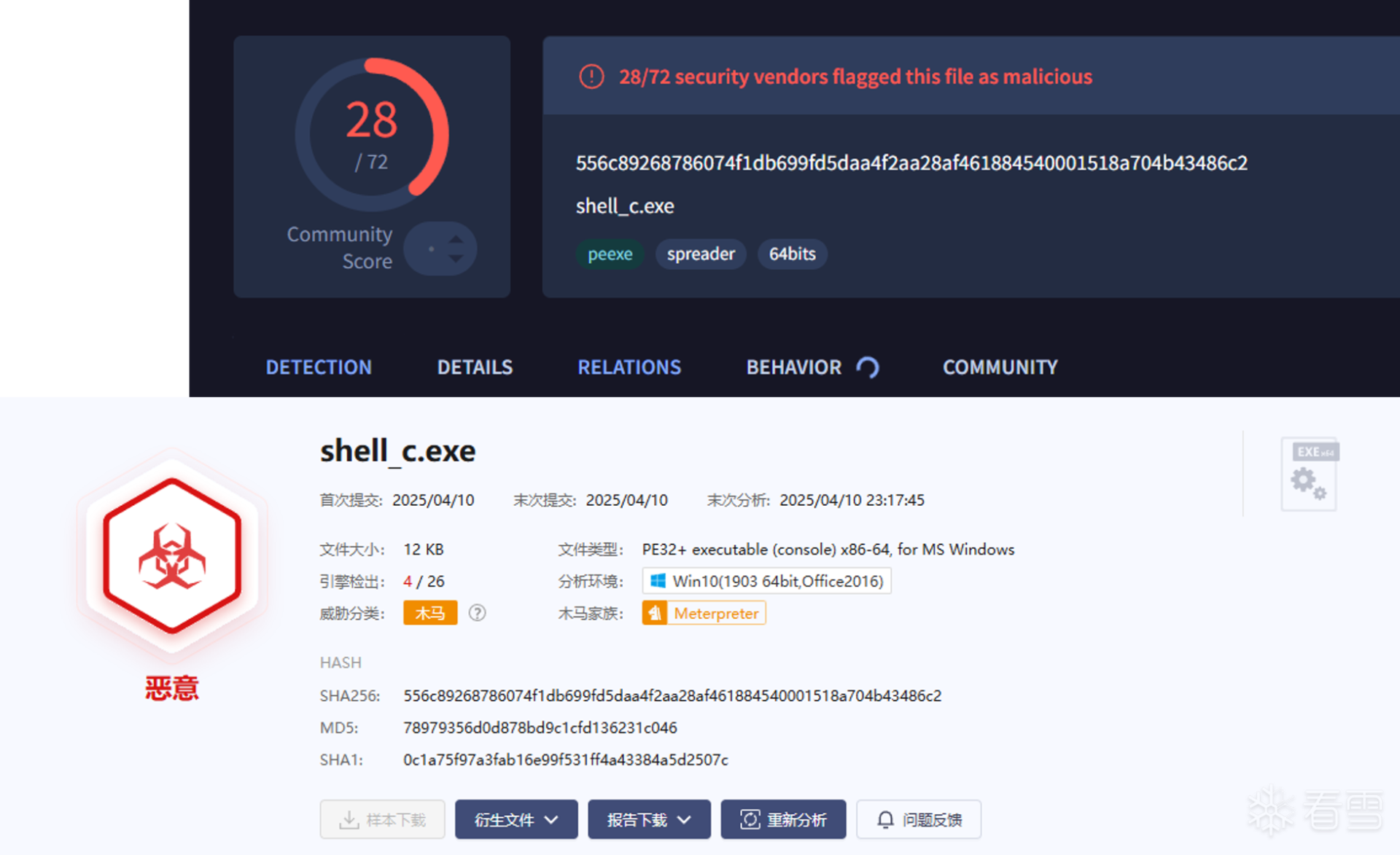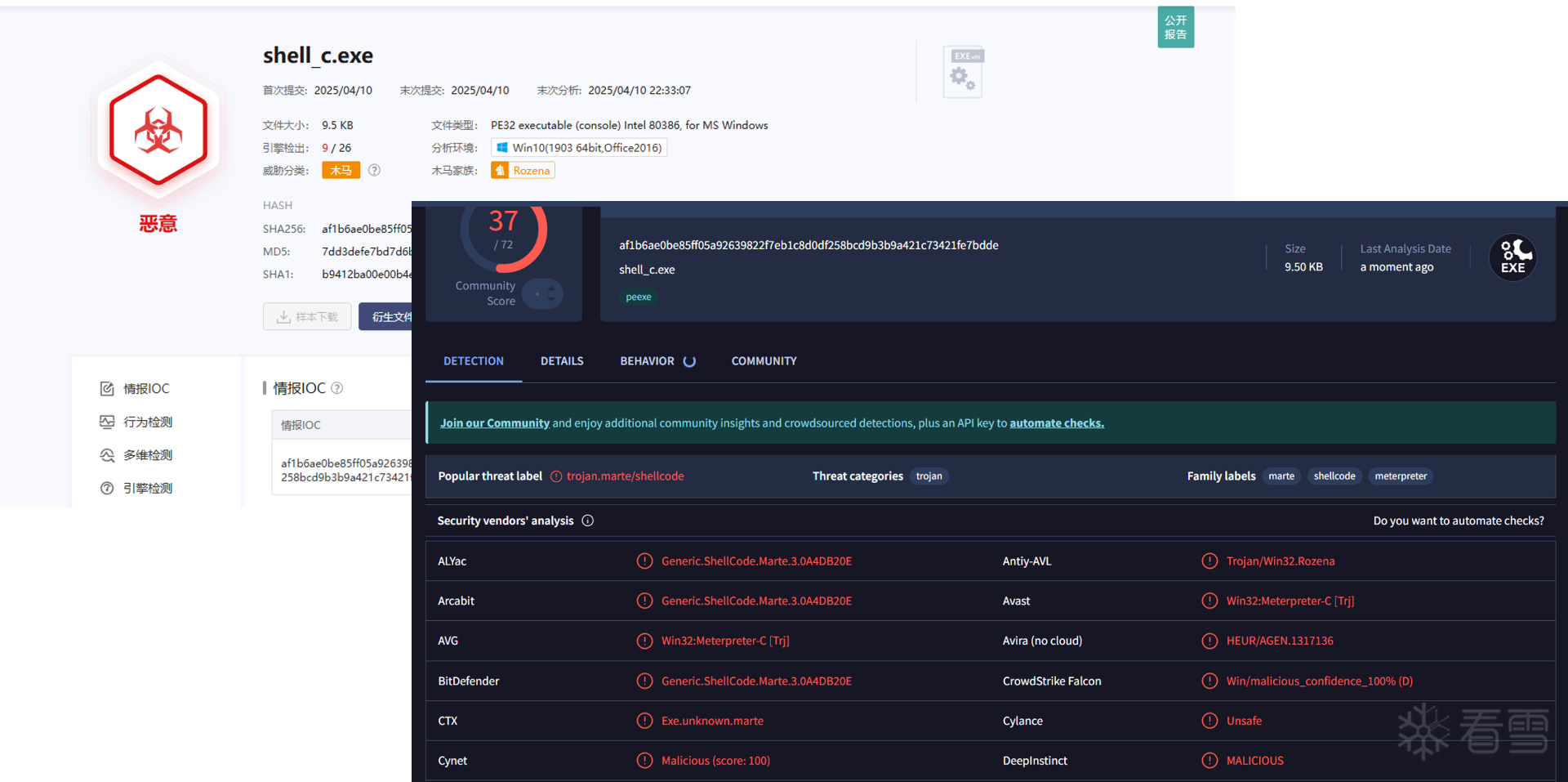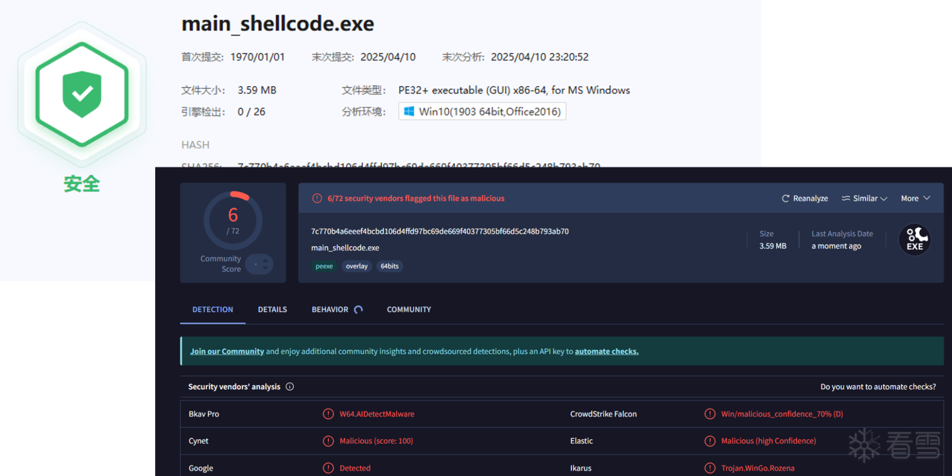 4.10号在测试,360、卡巴已经可以检测了,4月10日,微步、vt检测图如下