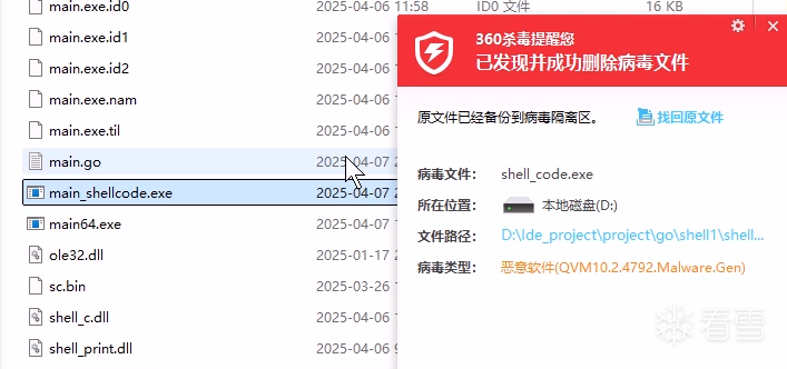 放弃原有思路,go写了个timer注入,执行上述shellcode,360扫描报毒,火绒轻松过