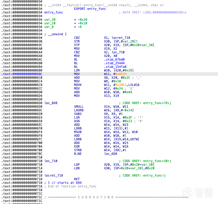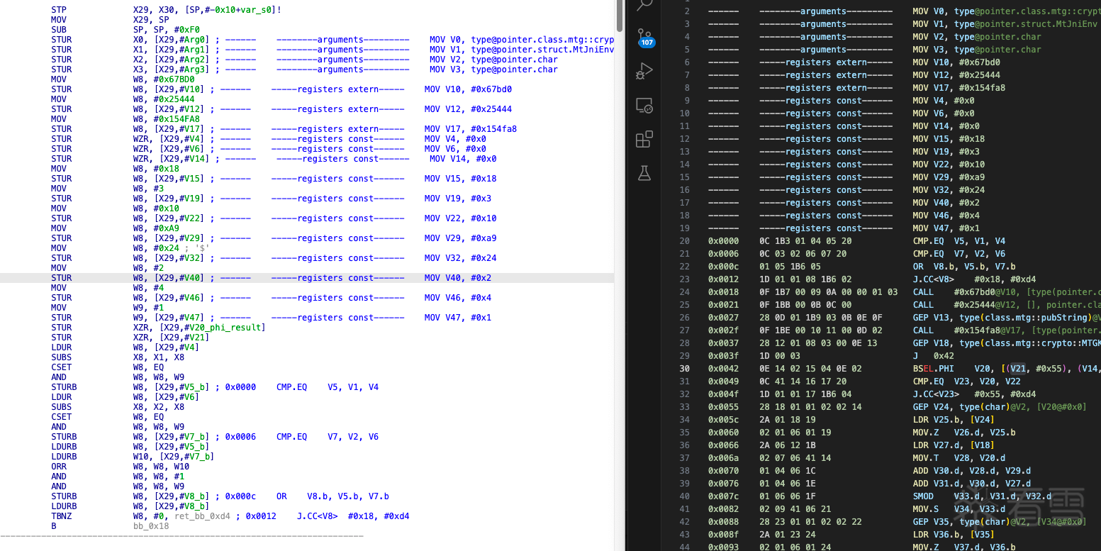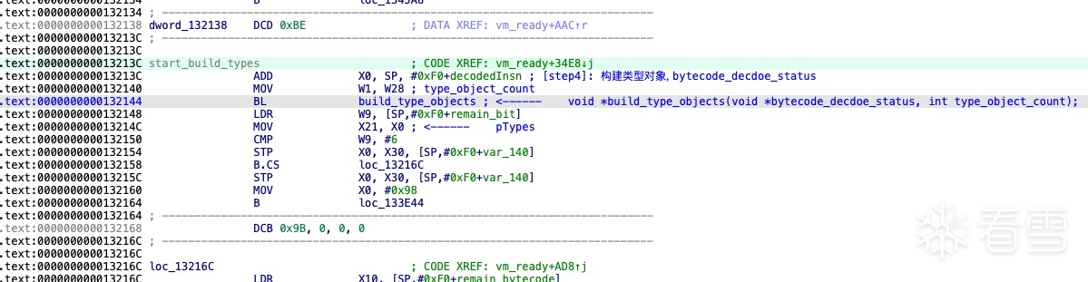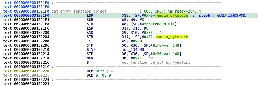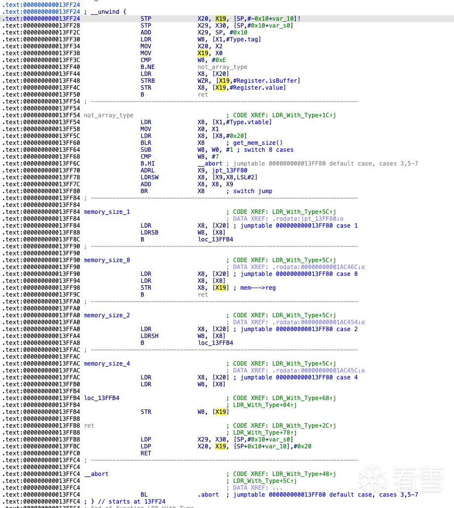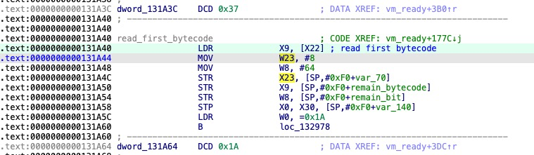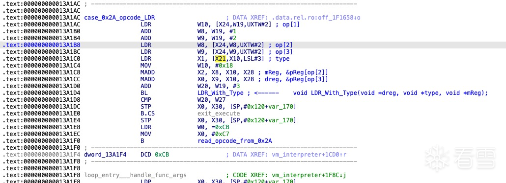 关键对象:虚拟机pc、指令对象、上下文对象、类型表对象、分支表对象(遇到分支指令时关注) 虚拟机pc: W19 指令对象: X24 上下文对象: X28 类型表对象: X21