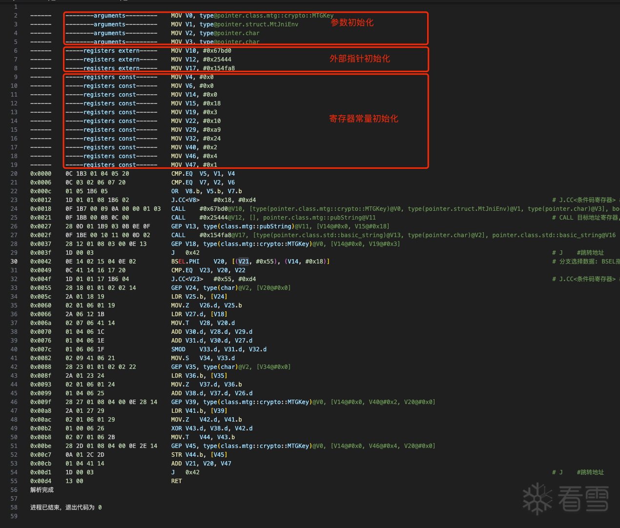 在首次解码过程中,部分寄存器将被赋予初始值。这些初始值来源于未加密的原始汇编代码常量,因其不可修改特性,需创建寄存器副本。