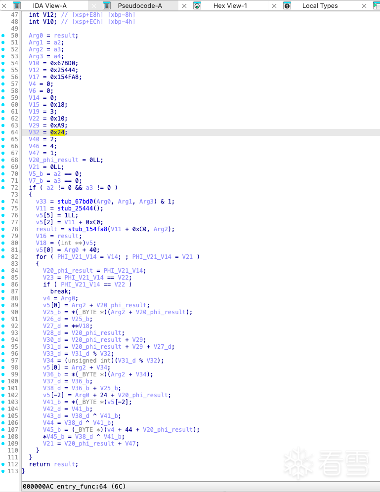 虚拟机入口点(vm_entry)的起始地址是 0x1313F0。在该地址处,存在 31 个引用地址,这些引用地址指示了 31 个将被虚拟化执行的函数的入口。其中,编号为 2 的引用地址指向了应用程序启动后首次执行的虚拟机代码。接下来,将从该地址开始逐步展开分析。 双击 2 号交叉引用后,定位到函数 0x6884C。该函数的原型中,x0-x2 对应前三个参数:bytecode、bc_size 和 external。其余参数作为可变参数部分,可能通过寄存器 x3-x7、Q0-Q7 以及堆栈进行传递。