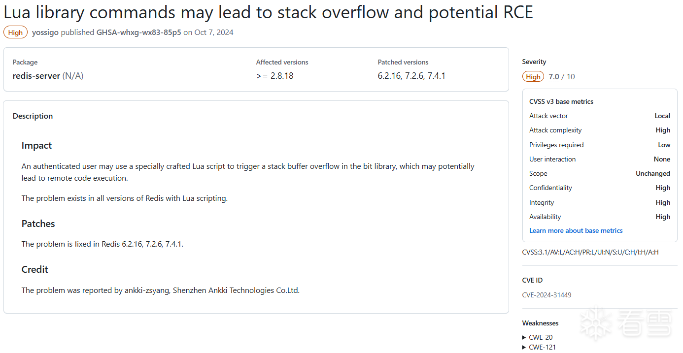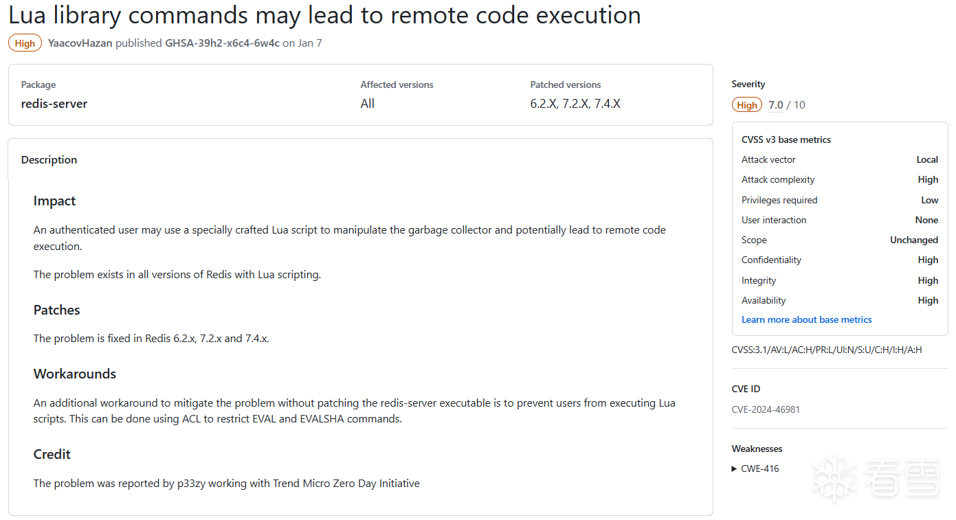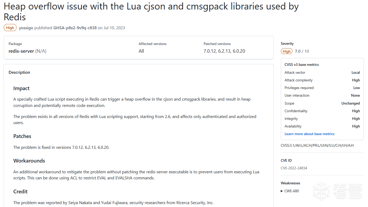 《Redis漏洞分析》对其中的Moderate、High级别漏洞进行分析,同时根据Redis的攻击面进行分篇,本篇是lua脚本篇。