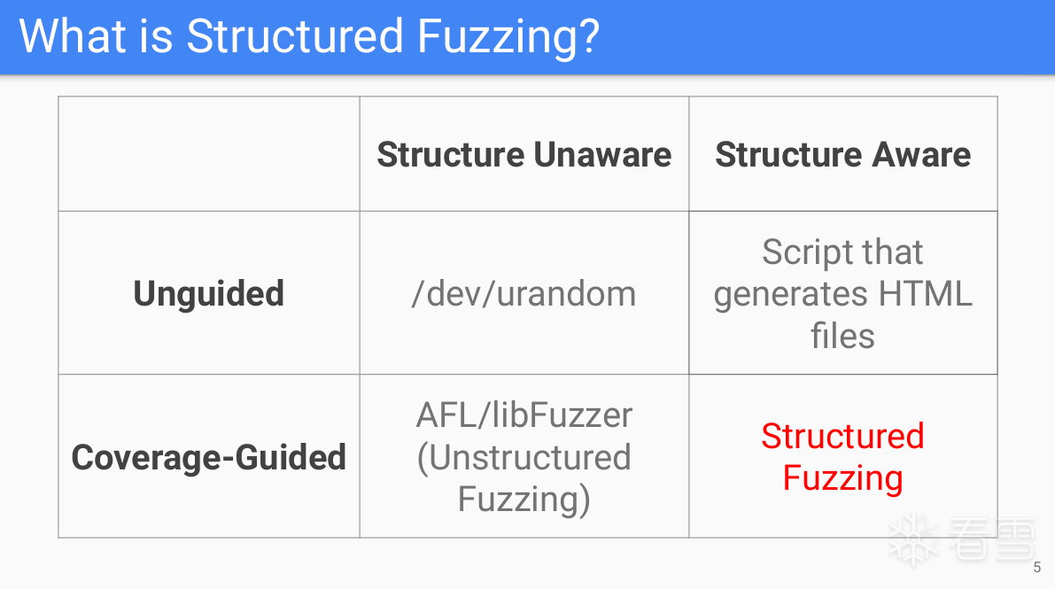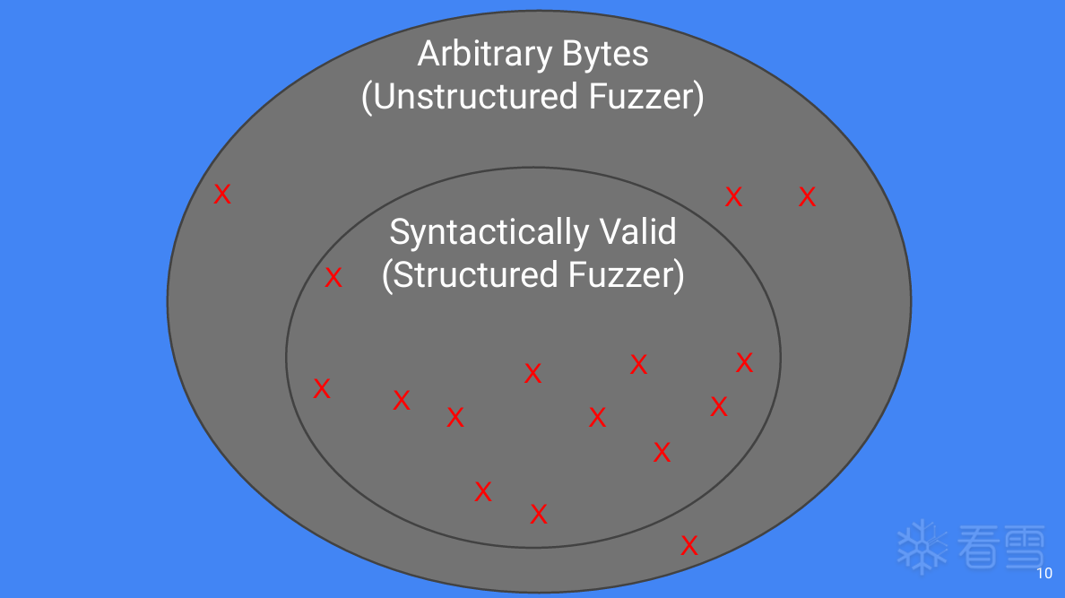 - 理论上非结构化感知的fuzzer也可以发现深层逻辑的bug(重叠部分)。这本质上是概率问题,但是在时间维度上,可能到fuzz到宇宙的尽头。